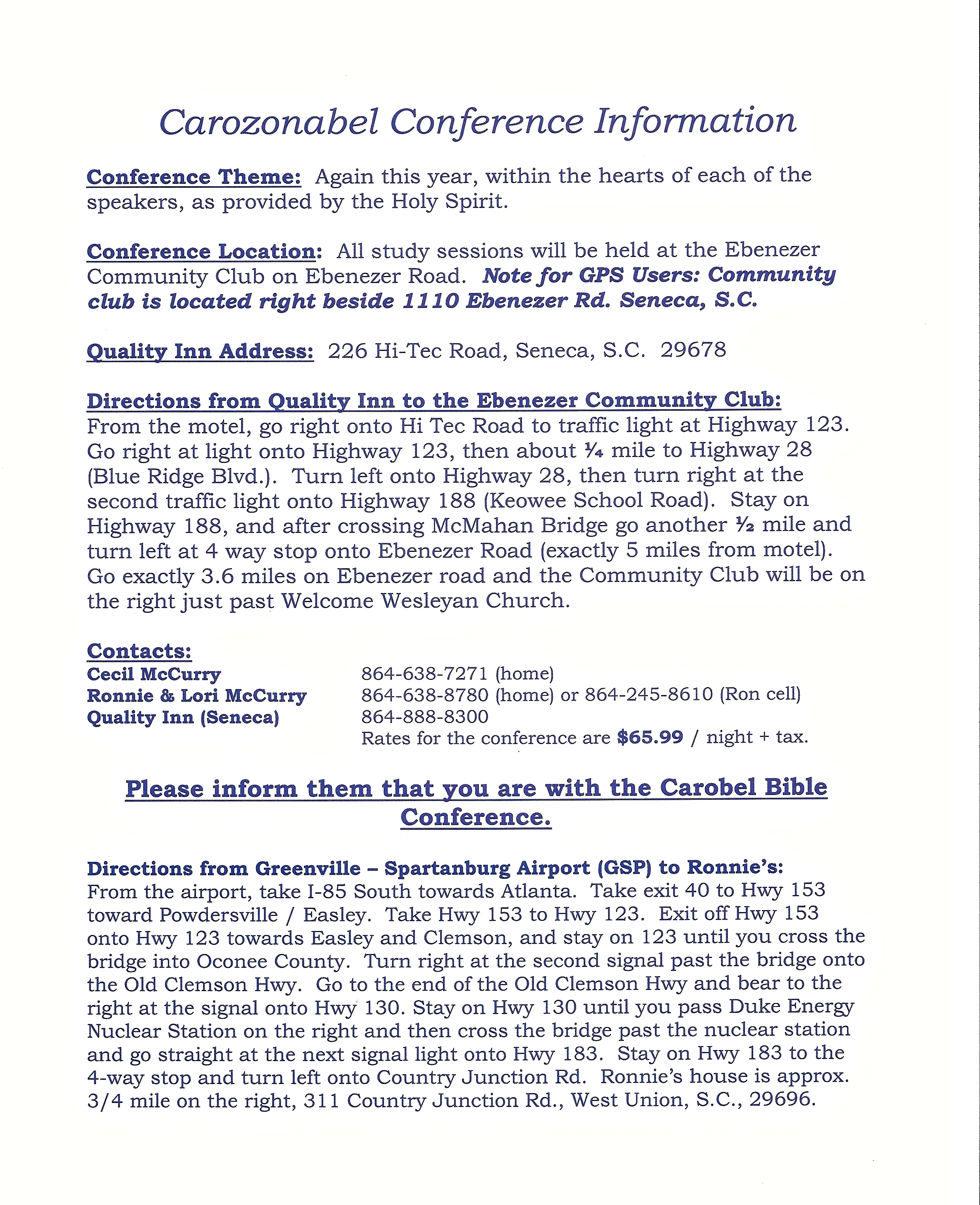 2014 Carozonabel conference schedule, directions, speaker roster, menu,