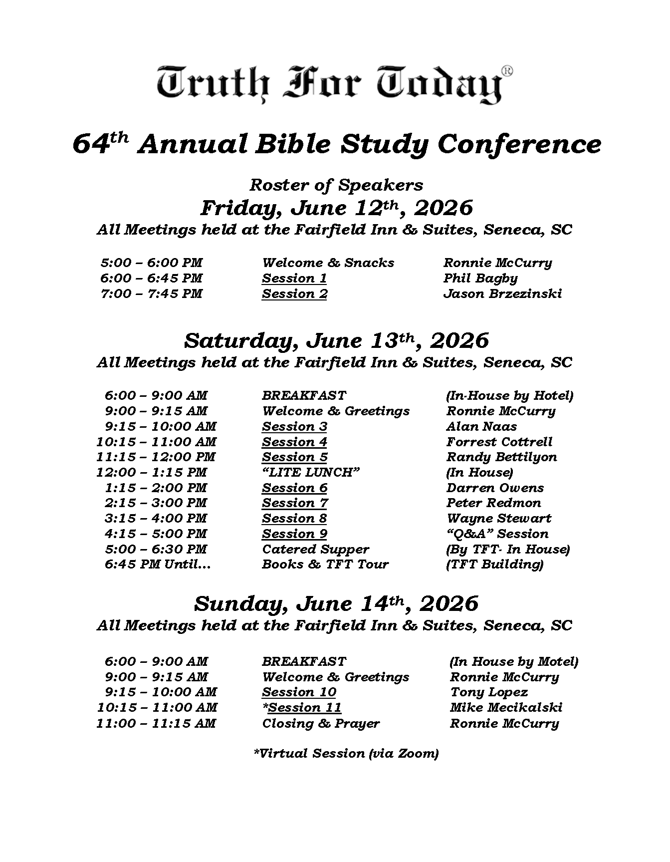 Time is drawing nigh for our 59th annual TFT bible conference! Please make plans to join us for the 2019 conference to be held again this year in Clemson, SC from April 26th thru April 28th at the Holiday Inn Express meeting room (same as last year). The address for the Holiday Inn Express hotel is 1381 Tiger Blvd, Clemson, SC, 29631. Their phone number is (864) 654-9410.